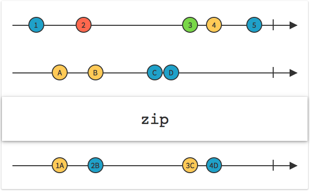 zip 操作符将多个(最多不超过8个) Observables 的元素通过一个函数组合起来,然后将这个组合的结果发出来。它会严格的按照序列的索引数进行组合。例如,返回的 Observable 的第一个元素,是由每一个源 Observables 的第一个元素组合出来的。它的第二个元素 ,是由每一个源 Observables 的第二个元素组合出来的。它的第三个元素 ,是由每一个源 Observables 的第三个元素组合出来的,以此类推。它的元素数量等于源 Observables 中元素数量最少的那个。