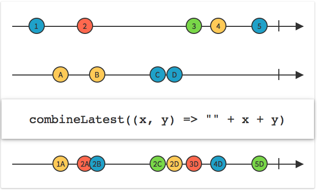 当多个 Observables 中任何一个发出一个元素,就发出一个元素。这个元素是由这些 Observables 中最新的元素,通过一个函数组合起来的。