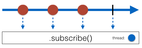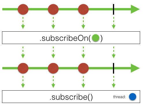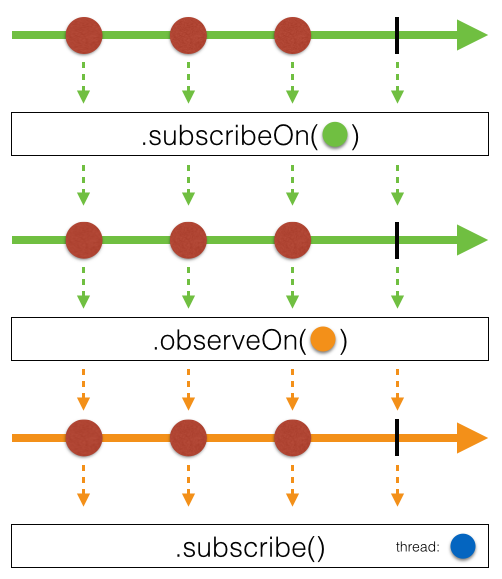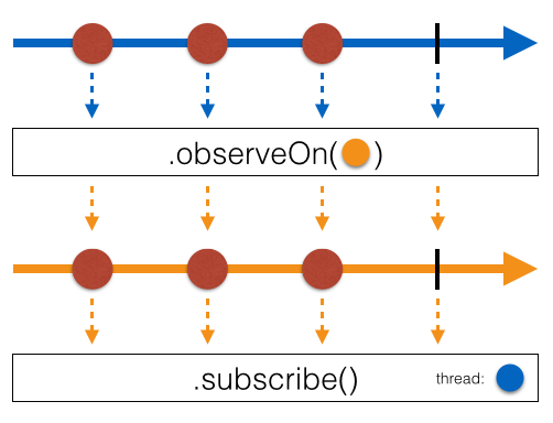 如果你的代码片段在主线程中,默认情况下Observable的创建是在 .subscribeOn() 定义的线程上,但是,调用 .observeOn() 之后,余下的代码将会执行在 .observeOn() 所定义的线程上: