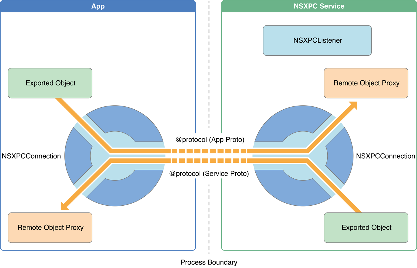 在 App 端,我们有一个 connection 对象。每次将数据发给 service 时,我们需要调用 remoteObjectProxyWithErrorHandler 方法来创建一个远程对象代理 (remote object proxy)。