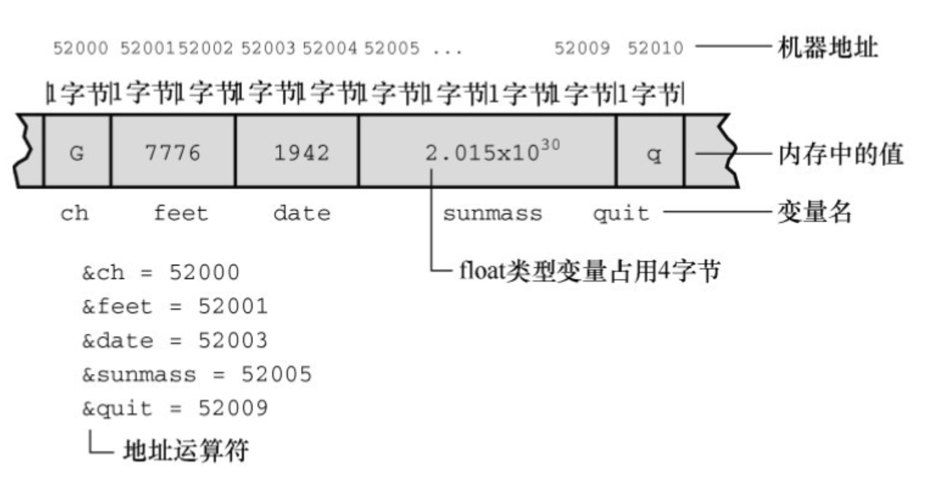 通过前面的讨论发现,变量的名称、地址和变量的值之间关系密切。我们来进一步分析。 编写程序时,可以认为变量有两个属性:名称和值(还有其他性质,如类型,暂不讨论)。计算机编译和加载程序后,认为变量也有两个属性:地址和值。地址就是变量在计算机内部的名称。
