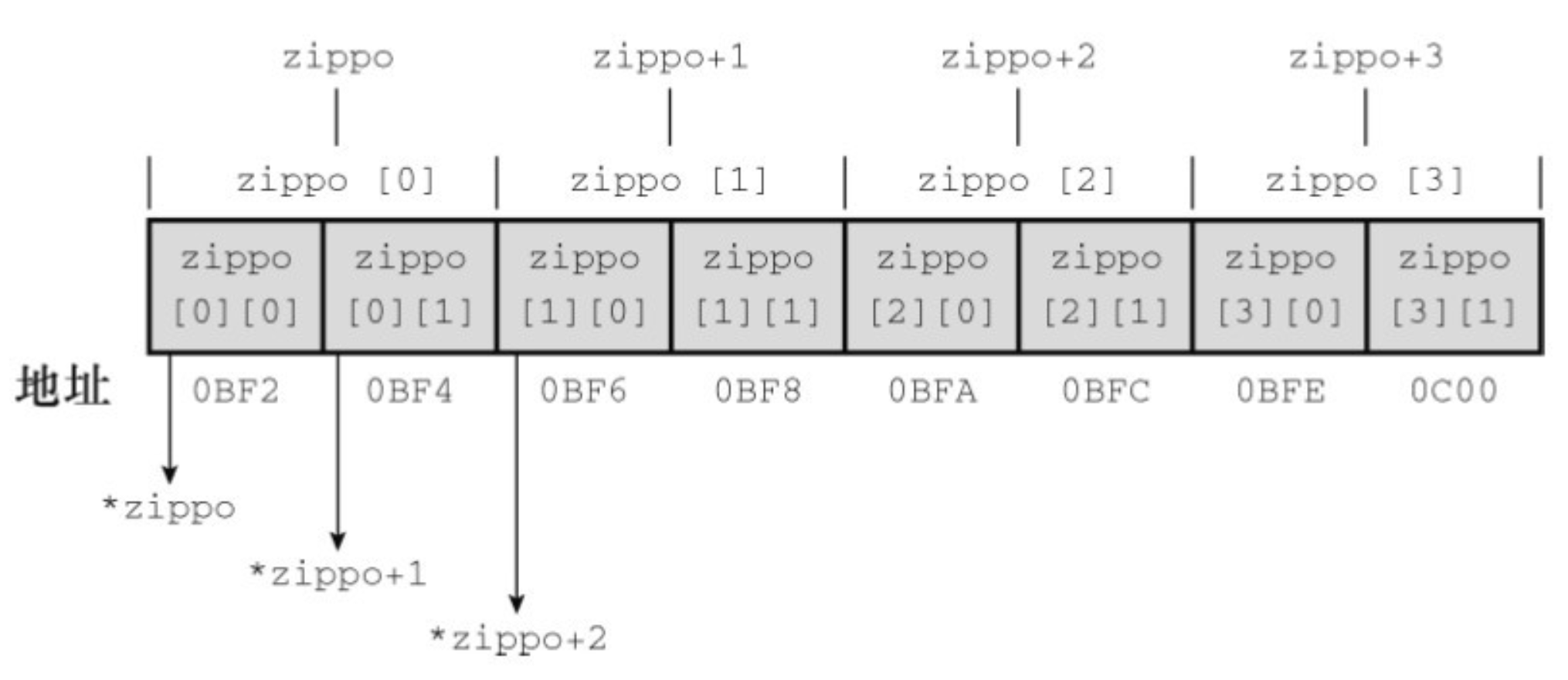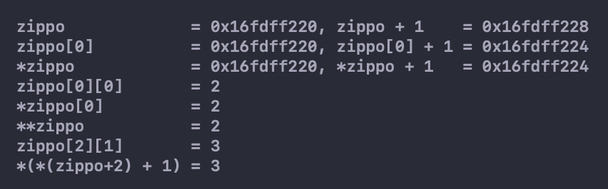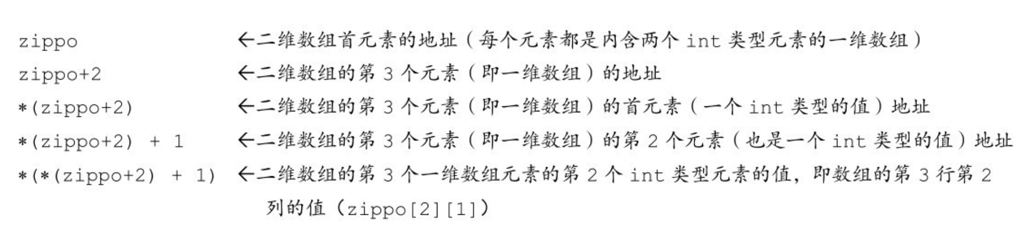表示ar指向一个内含 4 个int类型值的数组(在我们的系统中,ar指向的对象占 16 字节),所以ar+1的意思是“该地址加上 16 字节”。如果第 2 对方括号是空的,编译器就不知道该怎样处理。