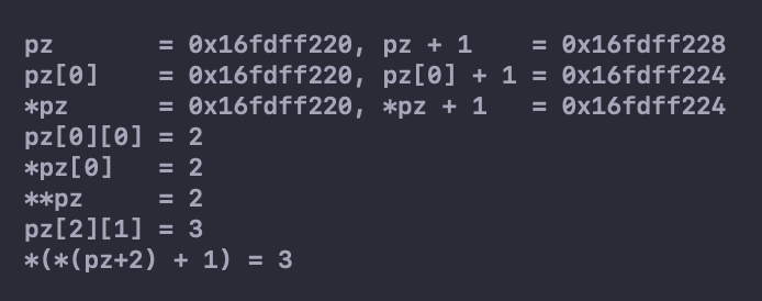 int (*pt2)[4]; // 声明一个指向二维数组的指针,该数组内含 2 个数组元素,