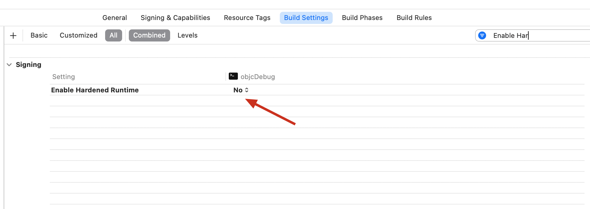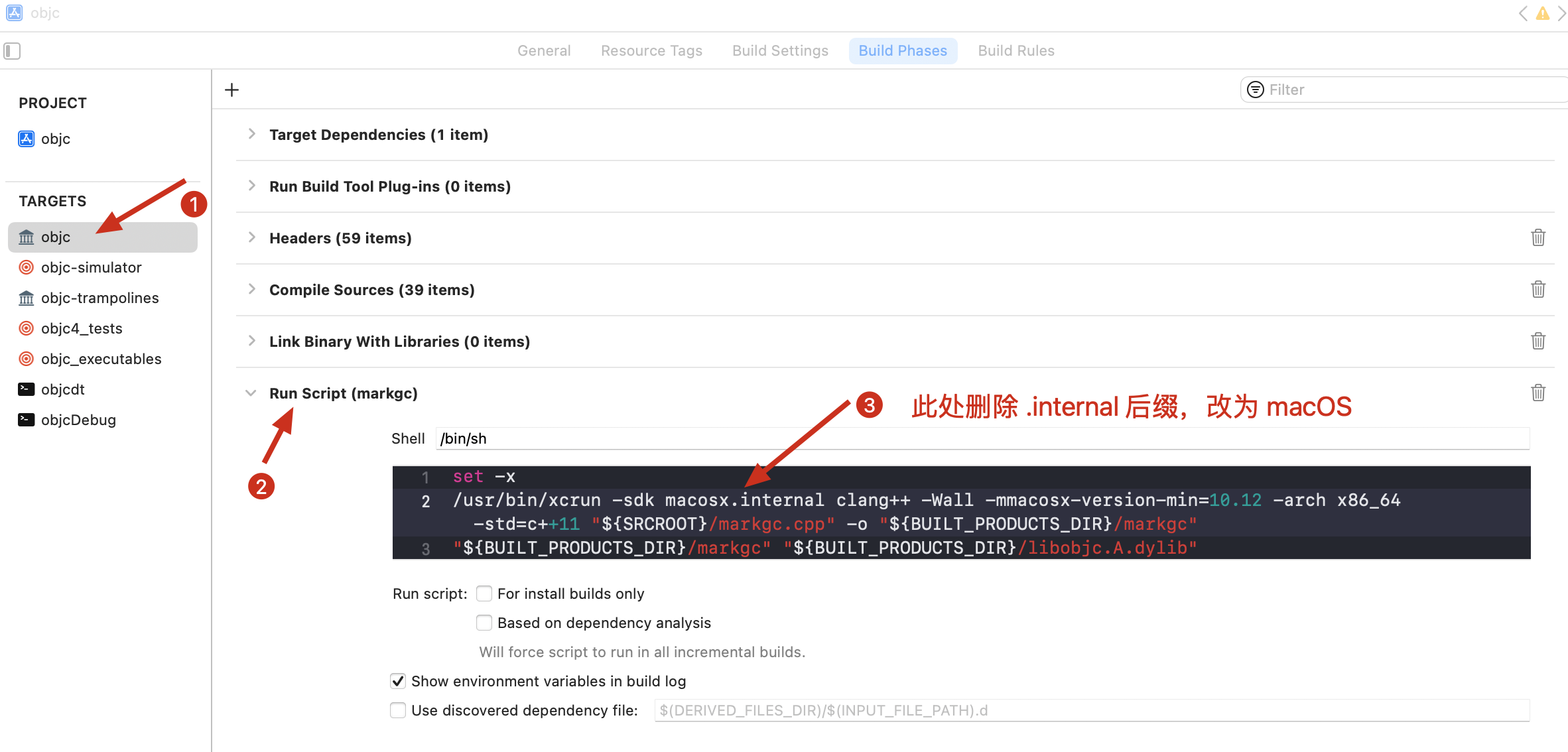 修改 objc target 的 Run Script (markgc) 脚本,将 macosx.internal 改成 macosx: