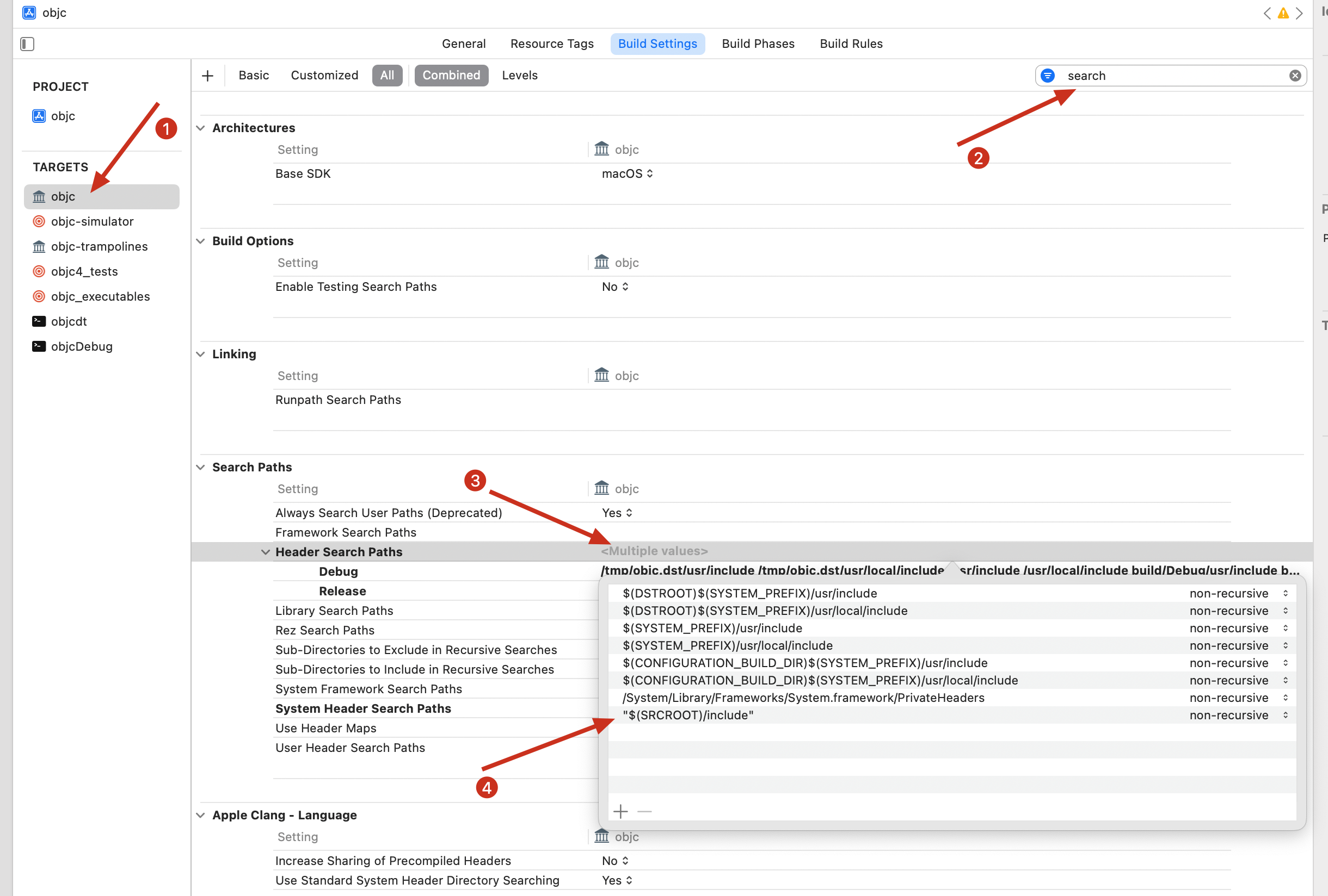 将我们刚才创建的 include 文件夹路径添加到 Header Search Paths 中