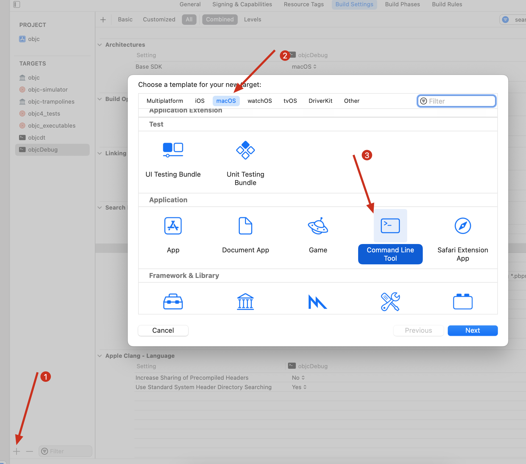 进行完上面的错误修复后,我们就可以创建一个用于调试的 target。如下图,我们创建一个 macOS 的命令行 target。